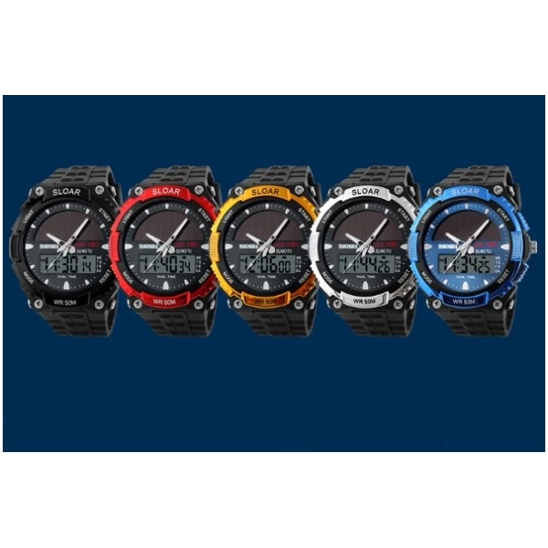 Brand new multifunctional Solar Power wrist watch with analog-digital time display provides wide varieties of performance. Auto Date, Repeater, Diver, Alarm, Chronograph, Water Resistant, Complete Calendar, Multiple Time Zone, Luminous, LED display, Shock Resistant, Stop Watch, Back Light. Item comes in different colors.
