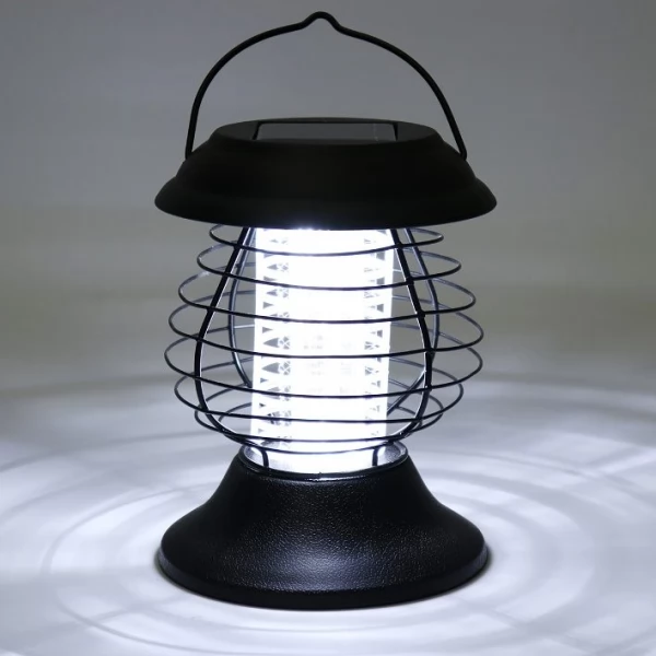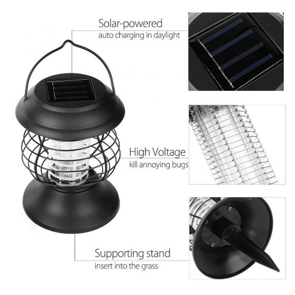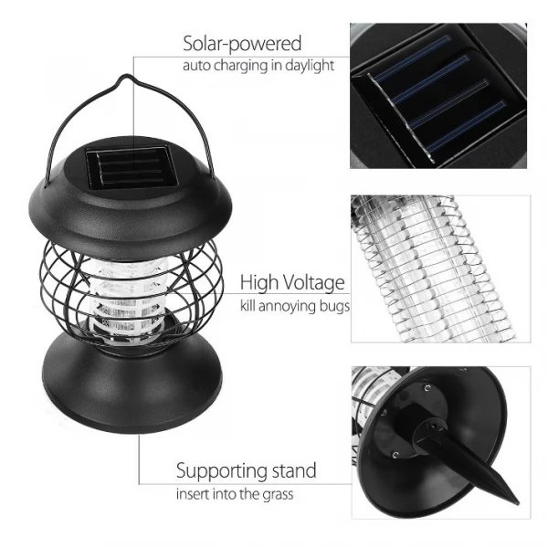 Outdoor Solar mosquito zapper Insect killer UV LED lamp is a device powered by Solar energy and do not require electric wires and additional sources of power. It provides energy-efficient physical control over mosquitos, bugs and insects to guard your family in an outdoor area whether it is the home backyard, garden, patio, BBQ, pool, balcony or any other resting zone on a fresh air. The Mosquito Zapper Lantern illuminates Ultra-Purple LED light that attracts insects to neutralize them by high-voltage electrode net around the light.