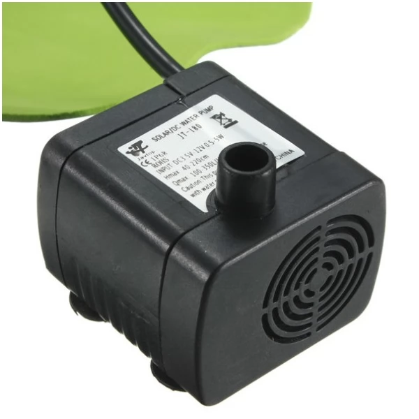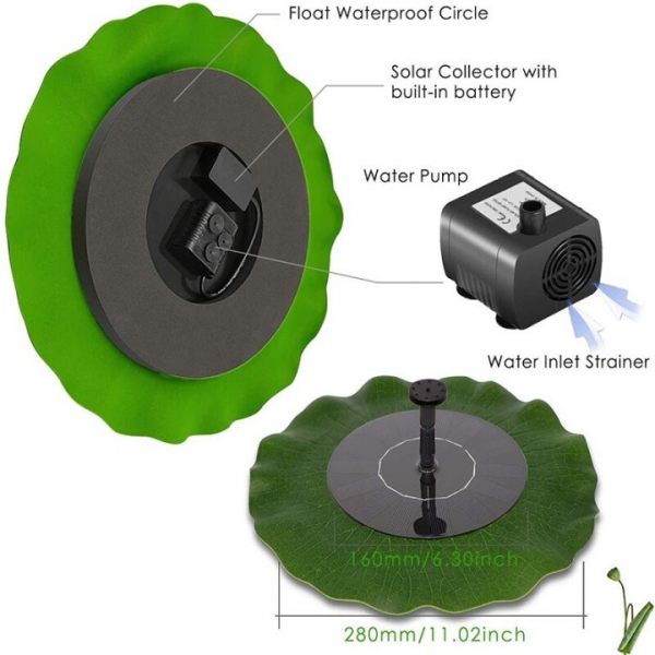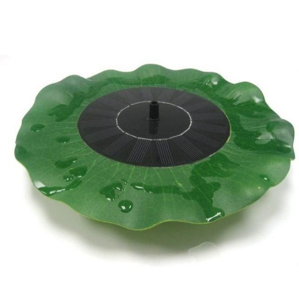 The Solar Lotus Leaf Water Pump Fountain is a floating solar-powered decorative fountain. Natural attractive appearance in the shape and style of green lotus leaf adds a lot of charm of wildness to a garden or pond. It is suitable and absolutely friendly for birdbaths, small ponds, fish tanks, garden decoration etc.