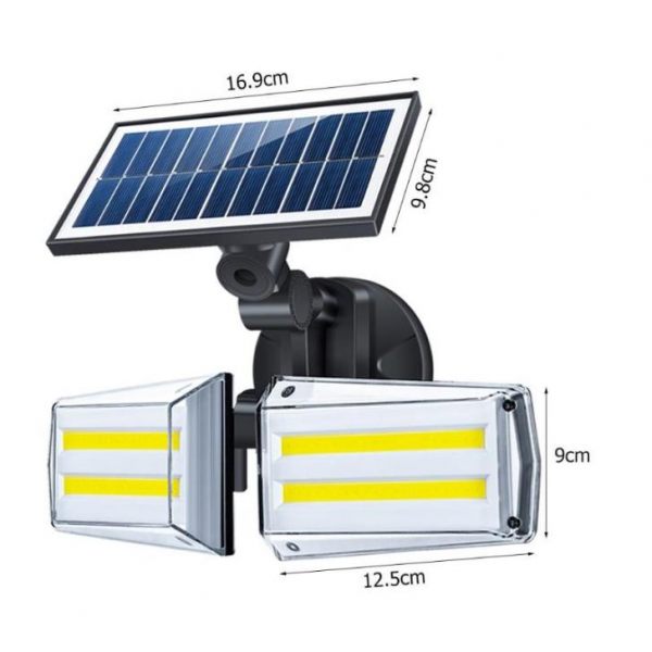 - Solar Panel of Bright 20W Dual Twin Head Solar Sensor Security Wall Light 80 COB LED should be installed in a well-lit area where it can receive maximum straight sunlight during daytime. Any cover that shades the Solar Panel will affect its ability to absorb sunlight and as a result, decrease a device’s performance.