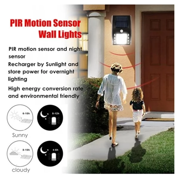 Outdoor LED Solar Pathway Light with PIR Motion Sensor and wall mount is an entirely Solar Powered product that does not require any additional electric wires or other sources of energy. Elegant design and attractive appearance combined with durability and high weatherproof level protection that makes the Light pathway resistant to the heat and humidity and suitable for extensive use e.g. around a house, at a garden, a backyard, a garage, a pathway, etc. Built-in PIR Motion Sensor provides energy-efficient and convenience way of lighting required area. The Light turns on when detects a movement or presence of people within about 3 meters. It is suitable, for example, to light the entrance to a home or garage. When it is dark the wall light is active, the PIR Motion Sensor detects someone approaching the door and automatically turns the LED lights on. Then it automatically turns off and comes back to sleeping mode before subsequent motion detection. The automatic light sensor makes the pathway light almost maintenance free product; it does not require switching it on and off all the time. The sensor detects the level of light and changes the mode between day and night and adjusts performance characteristics.