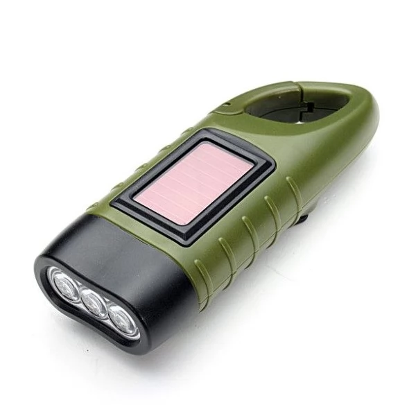 This is High-quality Portable Light Weight Solar Power Flashlight with additional Hand Crank Dynamo. Two available sources of Green Energy would never let you run out of Power. Efficient Solar Panel provides enough energy for a flashlight, and even on a rainy day you will still have access to the Clean Power. Just use the Hank Crank Dynamo to mine the Energy. Crank the Light for 1 min provides 3 min of Light. Not long enough?! Then keep cranking, it can be a good exercise for your arm.