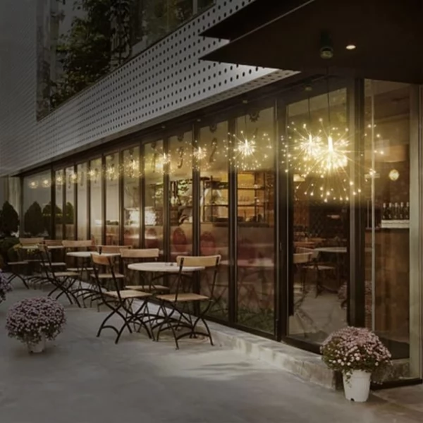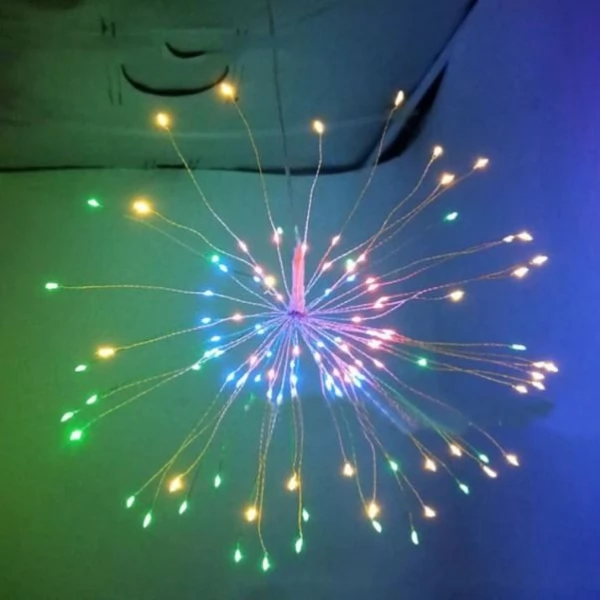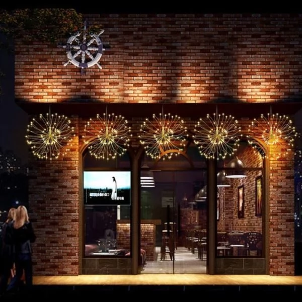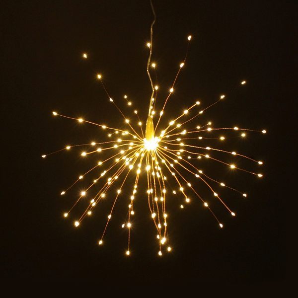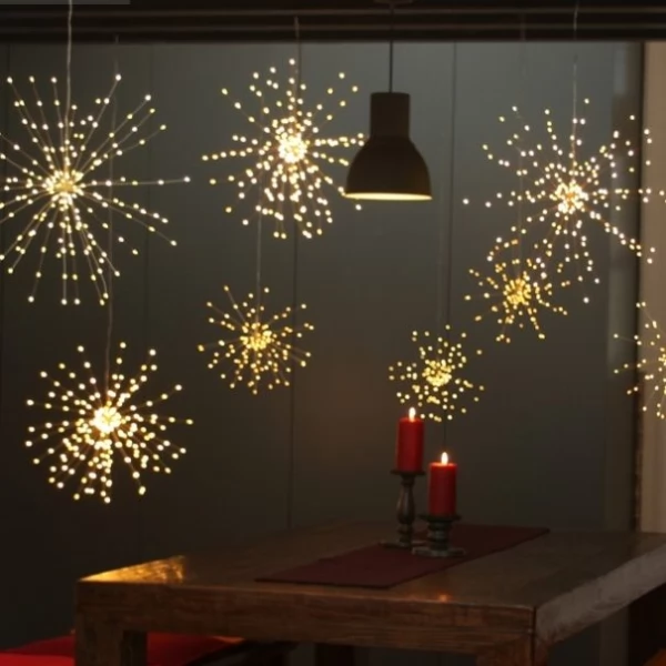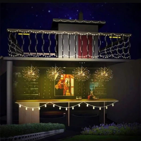 Firework 200 LED Solar Christmas Lights Decoration Starburst Hanging Garland is ideal for interior and exterior decoration around the house, garden, porches, patios, decks, balconies & verandas, side and backyard, aisles, entryway, path, fence etc. The product can be widely used in windows, shops, stages and other places, especially as a Garden or Christmas tree decorative LED lights to create a warm and romantic holiday atmosphere.