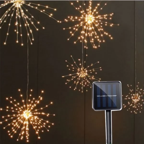 Firework 200 LED Solar Powered Christmas Lights Starburst Hanging Garland outdoor decoration has energy-efficient Solar Panel that absorbs the sunlight during the day and converts it into the energy which stores at the rechargeable battery to power the light up at night. The product has 8 different adjustable operation modes that allow changing the lighting performance.