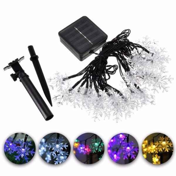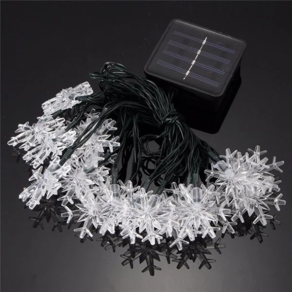 Snowflakes 20 LED Solar Powered Christmas Lights Tree Decoration Fairy String is brand new high-quality DIY outdoor lighting product powered by Solar Power and does not require any electric wires or additional sources of energy. Built-in automatic daylight sensor will operate the LED Fairy light string on a regular basis by activating the Lights at night and put it into the charging mode during the day.