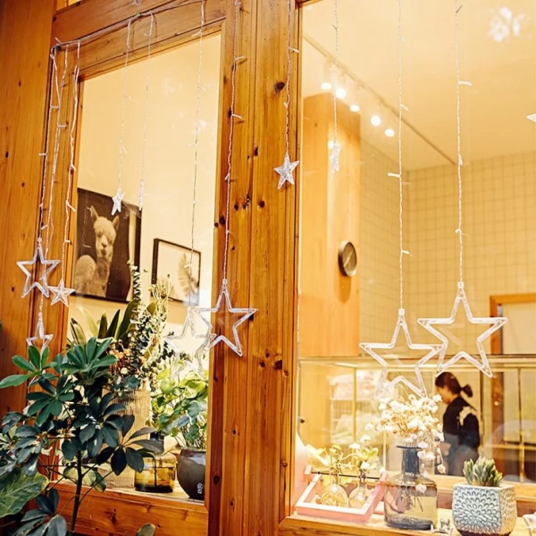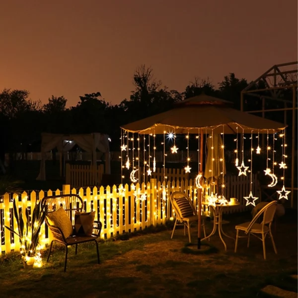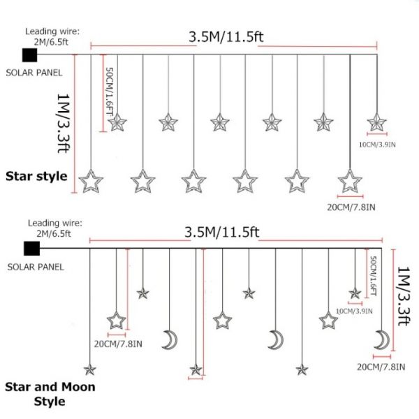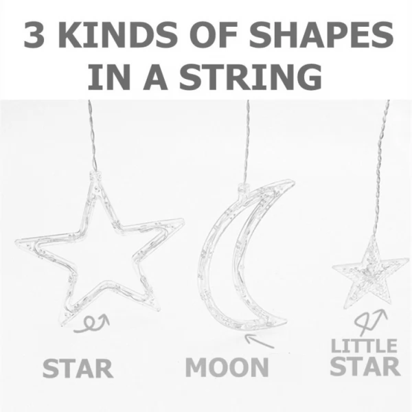 - Bright dimmable performance of this 5.5m long Curtain Style Hanging String garland delivered by high-quality bright 123 LED/ 138 LED (Stars Only Design) beads with high colour rendering along with soft natural light with no light decay. There are 12 strings with Stars/ Moons hanging from the main string.