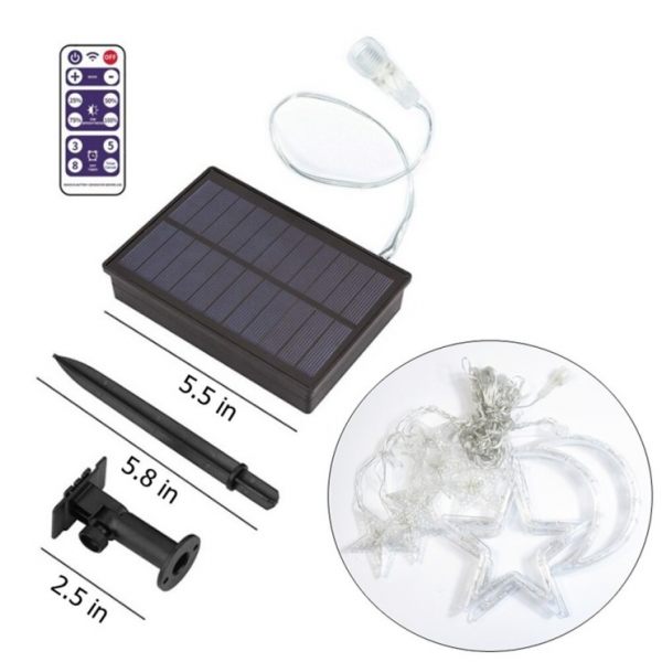 Bright Solar Christmas String Lights LED Stars Moon Outdoor Garland Decoration is an advanced high-quality holiday light with Remote Control and 8 Lighting Modes. New 2020 design features improved and increased in size solar panel with enhanced Li-Ion 1200mAh battery. Brightness adjustment, AUTO light control [Dusk To Dawn], Timer function and up to 36 hours of lighting this featured LED curtain fairy lights are suitable for various residential and commercial applications including trees, garden greeneries, walls & fence decoration