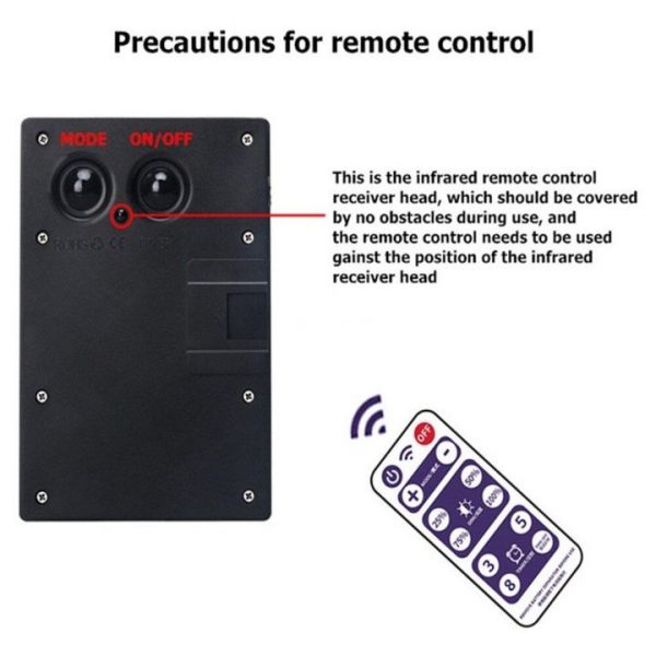 Please note, the Infrared Receiver for the Remote Controller is located at the back of the solar panel. The Remote control pad should be pointing directly at the receiver within 5m to ensure the signal is transmitting properly.