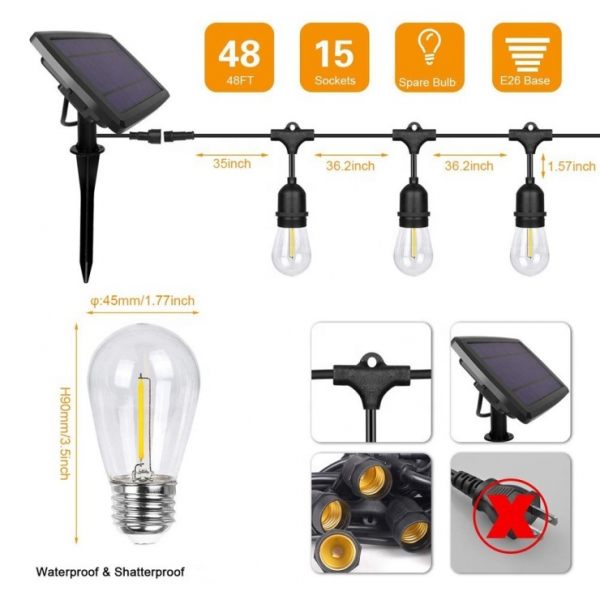 - Solar Panel of Vintage Outdoor Solar Fairy String Lights LED Glass Bulbs should be installed in a well-lit area where it can receive maximum straight sunlight during daytime. Any cover that shades the Solar Panel will affect its ability to absorb sunlight and as a result, decrease a device’s performance.