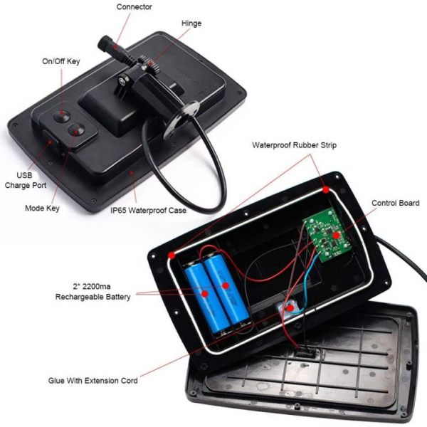1. Connect the solar panel control box with ground spike and holder and place it under the direct unsheltered sun for proper charging of the battery during the day. Please make sure the solar panel is not sheltered; otherwise, it will impact the charging via solar power.