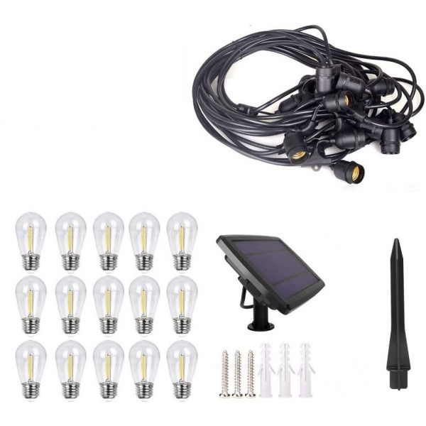 Vintage Outdoor Solar Fairy String Lights LED Glass Bulbs Decoration is a Premium high-quality commercial-grade product for residential and business premises decoration. The stylish retro design of 15 LED Glass Bulbs delivers Warm White festive illumination to create an amazing holiday vibe lasting up to 8 hours. A Maintenance-Free light control system activates the lights automatically at night and turns them off during the day. Suitable for outdoor and indoor application, this 15-meters long heavy-duty garland is a great option for the coming Christmas season.