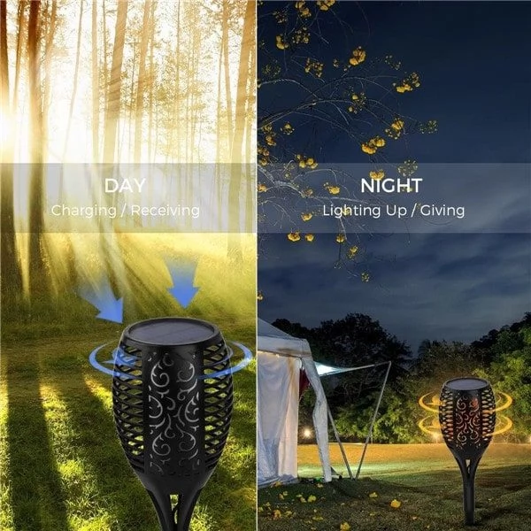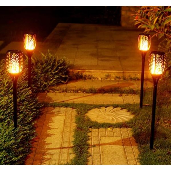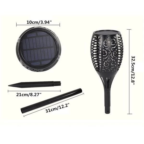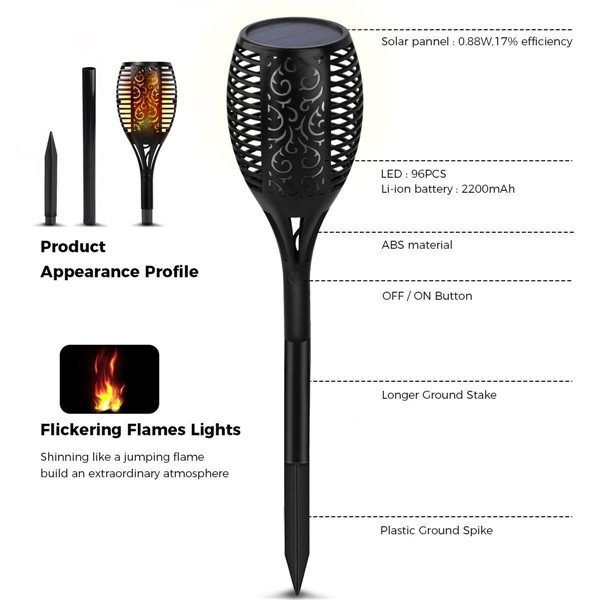 Dancing Flame Solar Tiki Path Light 96 LED Flickering Torch for Landscape Decoration is a high-quality durable waterproof light with multiple features. The LED path light is fully operated by Solar Energy with efficient Solar Panel and powerful built-in rechargeable battery and does not require any wires or electrical power grid cords.