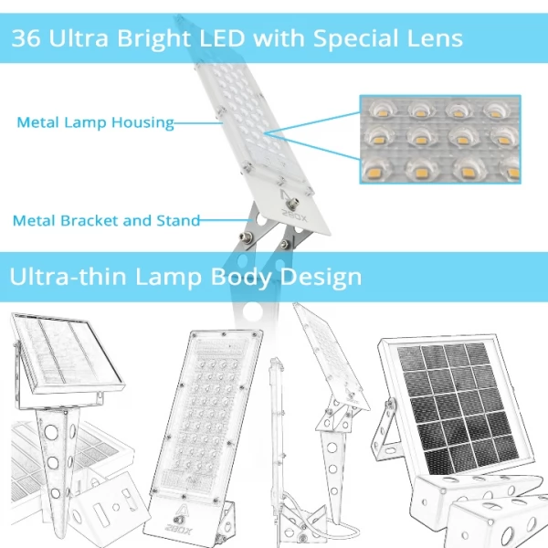 Universal Compact Ultra-Bright 36 LED Solar Flood Light Garden Landscape Signs Application with a remote solar panel is a high-quality heavy-duty waterproof product for outdoor landscape lighting and decoration. Comfortable Soft Warm White output with a Special design of the lens enhances the brightness. Maintenance-free AUTO daylight sensor operates the light from Dusk to Down with 3 Lighting Power Modes including Full Brightness, Medium and Energy-saving modes with up to 24h of illumination. The ultra-thin design is suitable for residential and commercial setups