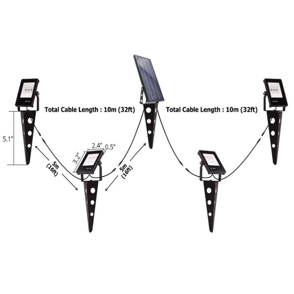 - Ultra-thin FOUR independent light heads connected to the solar panel with TWO 10m cables [5m between each head, as per photo].