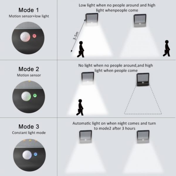 The street lamp has a built-in automatic daylight sensor that activates the lamp when it gets dark and turns it Off with daylight. The solar light lamp operates in TREE different modes including energy-saving and PIR Motion Sensor modes.