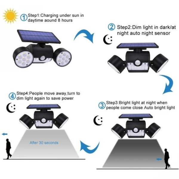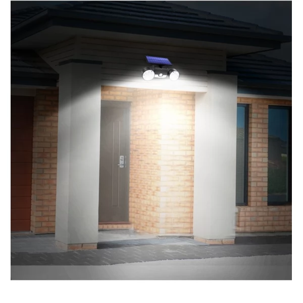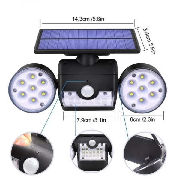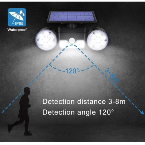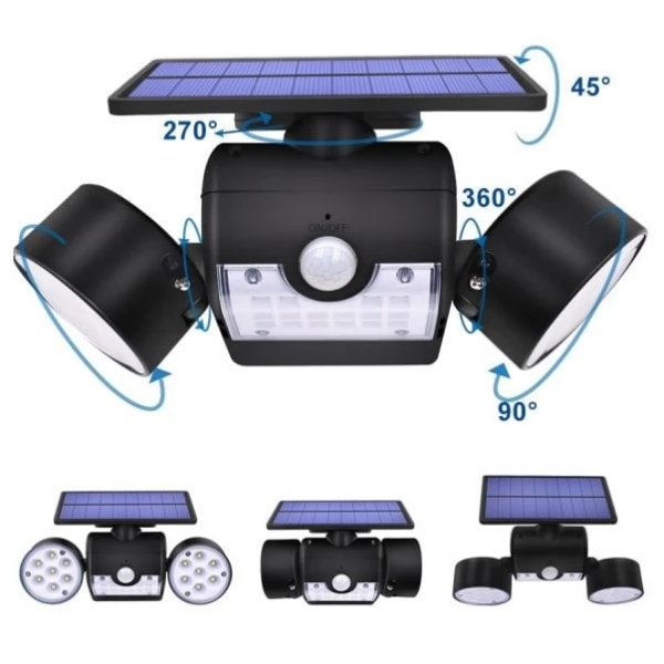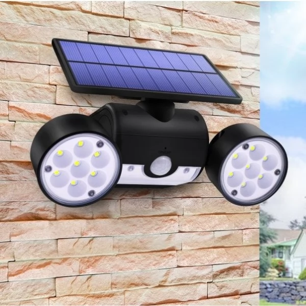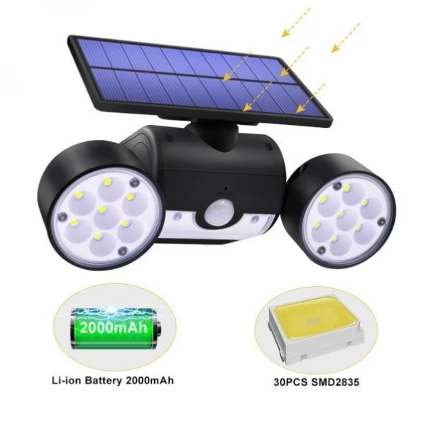 Bright Adjustable Angle Dual 30 LED Solar Wall Security Spotlight with Motion Sensor for home or garden security is a high-quality durable waterproof product with multiple features. The Dual Head LED Spotlight is fully operated by Solar Energy with efficient Solar Panel and powerful built-in rechargeable Lithium battery and does not require any wires or electrical power grid cords.
