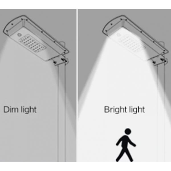 All-In-One Solar Street Light with PIR Motion Sensor 15W Security Lamp is a high-quality weather-resistant product suitable for residential and commercial application. Bright Performance up to 1500lm delivered by Top SMD3030 LED Chip. Maintenance-free automatic light control system [Dusk to Dawn] with PIR Motion Sensor and energy-saving DIM mode allows operating the LED lamp in various environments and stretching the lighting time to up to 36h. Large Capacity Lithium Battery is able to preserve energy to sustain the illumination for 3-5 rainy days