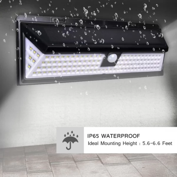 Ultra-bright 7W 118 LED outdoor waterproof wall Solar Powered PIR Sensor Light with wide lighting angle is an advanced lighting product with multiple features. It is fully operated by solar energy with an efficient solar panel in combination with powerful built-in 4400mAh rechargeable battery. The side LED's provide a wide spread of light and is ideal for covering large areas. The product designed for outdoor use with IP65 protection rating and does not require any additional electric wires or other sources of energy that.