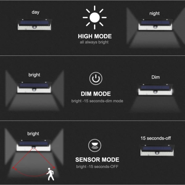 Outdoor 118 LED wall Solar Powered PIR Sensor Light has the following Lighting Modes: