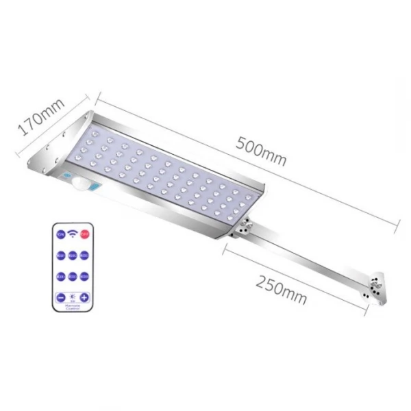 Outdoor advanced 96 LED Solar Street Lamp with Motion Sensor and six lighting modes is a high-quality durable lighting product with multiple features. Highly-efficient solar panel in combination with Lithium Iron Battery delivers bright and long-lasting performance. The light can be operated manually or via the Remote Control that allows shifting between different models including Motions Sensor with Energy-Saving DIM mode, constant lighting on and timing setting between 3 to 8 hours.