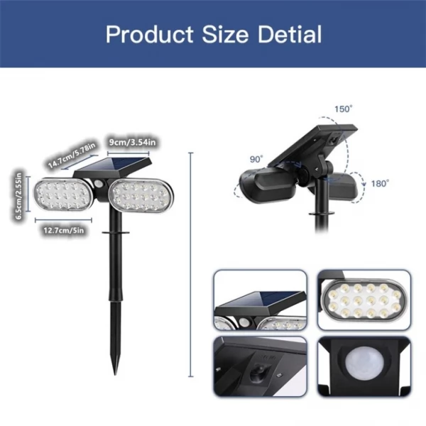 Bright 32 LED Dual Solar Path Light Motion Sensor Universal Spotlight delivers bright white reliable long-lasting lighting and is ideal for maintaining casual or emergency lighting at home and garden and various residential environments including the areas around the house, garage, garden, porches, patios, villas, balconies & verandas, side and backyard, aisles, driveway, gates and fences, stairs, entryway etc.