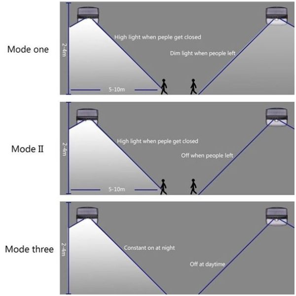 1. Press Mode Button for 3 seconds, wait for light blinks 3 times, auto light in DIM mode is set and will be turned all time from dusk. It will turns into full brightness when motion is detected within 5-8 m., 25s after it will be automatically switched into weak lighting.