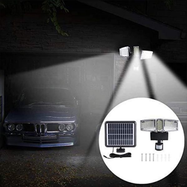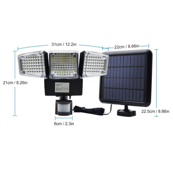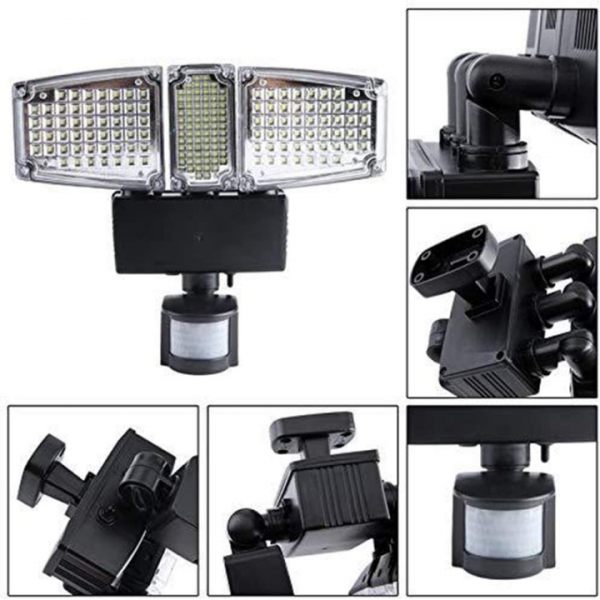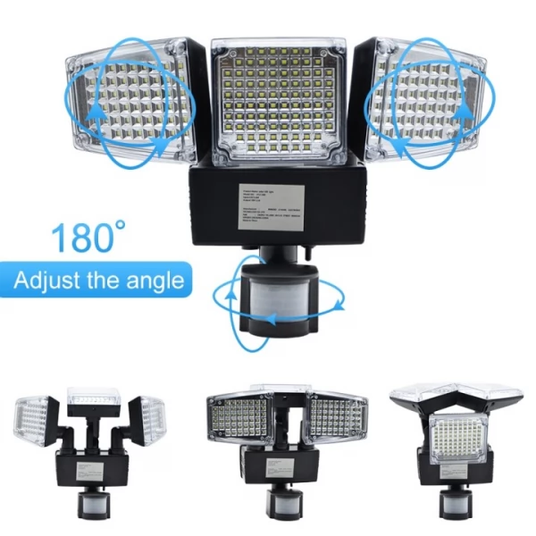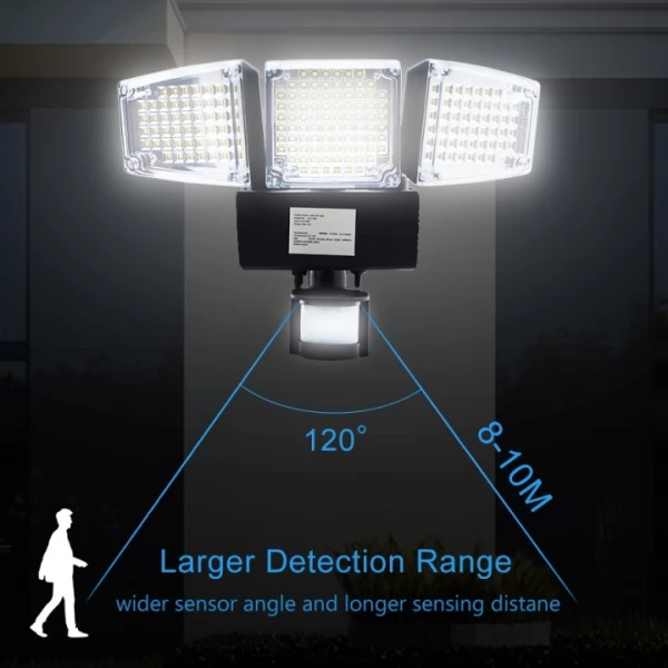 Three Head Super Bright 178 LED Solar Powered Security Wall Light with PIR Sensor is a high-quality and performance outdoor emergency lighting product with multiple features. The Mega Lamp has three independently adjustable LED lighting heads to cover wider angle and two major lighting modes including energy-saving DIM light mode before Full Brightness when Motion Sensor is activated.