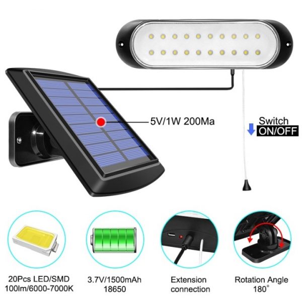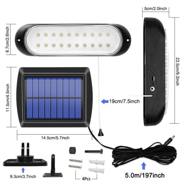 Compact Outdoor 20 LED Solar Shed Light Suitable for Indoor Daytime Application delivers reliable lighting on demand and is ideal for lighting up areas around the garage, basement, fence, patios, garden, yard, roof, stairway, driveways and other indoor and outdoor places. A detachable solar panel allows using the LED light in shade areas, under the roof and even indoor including any sheds, garages or stables etc.
