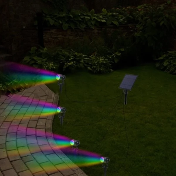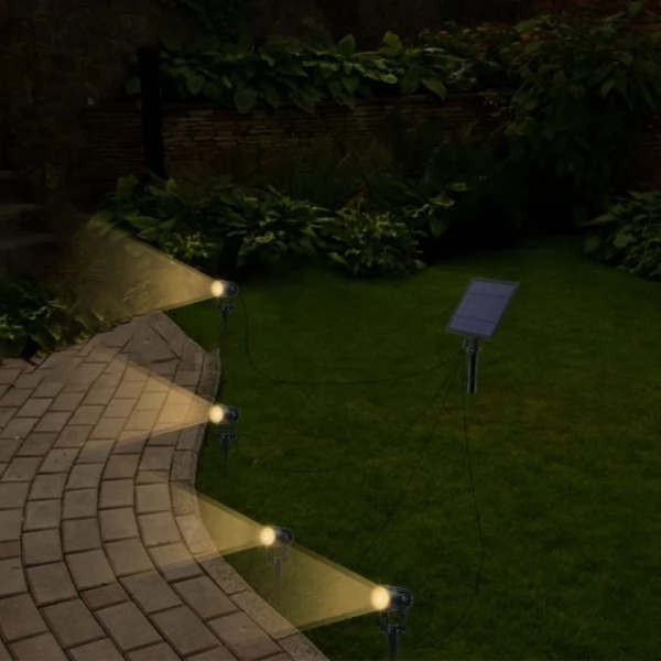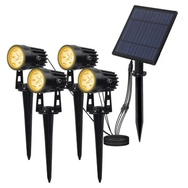 - Four independent light heads connected to the solar panel with 3m cord each.