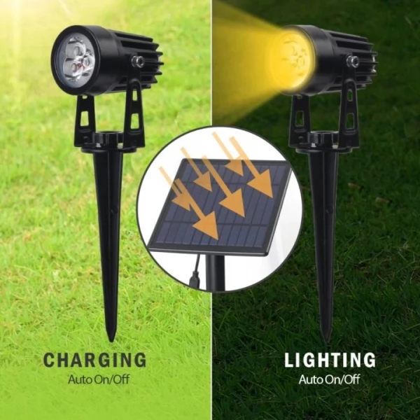 Outdoor Solar Spot Light 4-in-1 LED Garden Lawn Landscape Decoration for a park, lawn, tree decoration is a high-quality durable and grid-independent solar powered light with multiple features. Improved 3W Solar Panel with Powerful Lithium Battery powers four independent light heads 12 LED [3 LED per Light Head] with special magnify lens and adjustable 270° lighting angle make the spotlight ideal for various residential and commercial application. The lighting options include Full brightness and Low energy-saving mode to prolong the lighting up to 12h