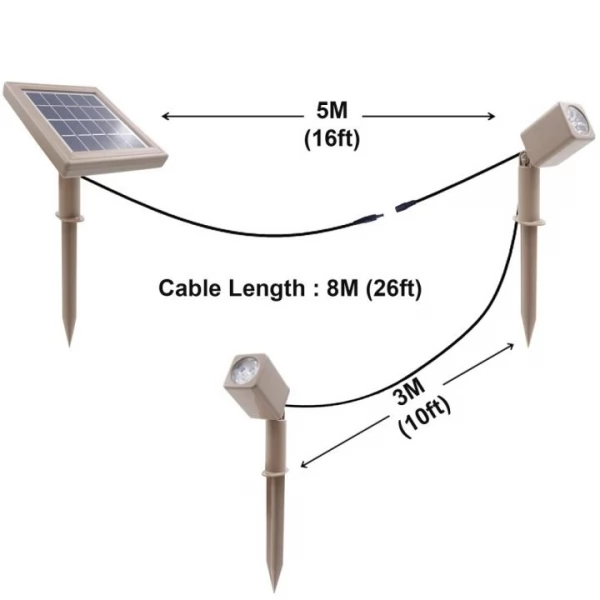 - A separate Solar Panel provides more flexibility in the installation and operation of the product with a 5-meter cable to the first head [additional 3m cable to the second light head].