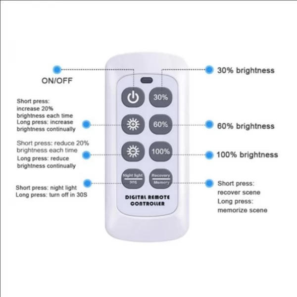 - Remote Control for distance operation with On and Off buttons and Brightness adjustment from energy-preserving 30% of the maximum lighting outcomes and 60% to 100% Full brightness.