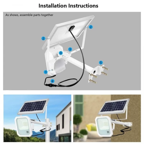 - Solar Street Flood Light Commercial Grade High Power LED lamp is fully solar powered lighting product. Solar Panel should be installed in a well-lit area where it can receive maximum straight sunlight during the daytime. Any cover that shades the Solar Panel will affect its ability to absorb sunlight and as a result, decrease a device’s performance.