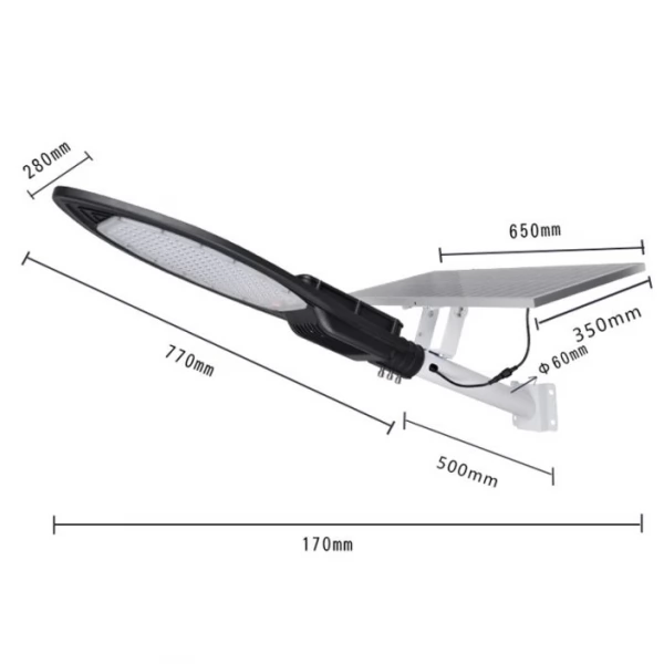 Solar Street Road Light with Strong Long-Lasting Battery and Bright Double LED is a high-quality weather resistant solar light for residential and commercial applications. It designed with extended performance in mind to prolong it on a single charge. The high capacity battery with charge indicator and intelligent lighting and timing pre-settings made to stretch the lighting for up to 36 hours after one full charge. It can be operated in maintenance-free auto mode or with the remote control.